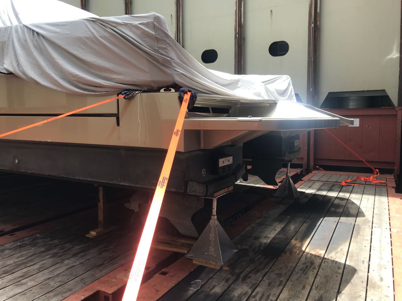 Of course the yacht will be safely secured on deck using lashing chain and belt. The number of belts being used is subject to the size of the yacht. The cradle is often even welded to the deck of the ship to ensure a maximum of safety and stability.